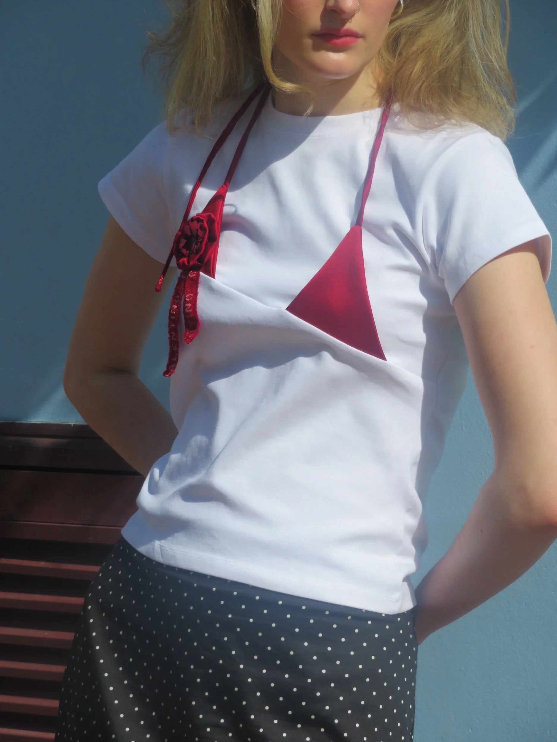 A one-off offcut tee featuring bikini cups and rosette crafted from an ex Valentino wool satin (ooo fancy), on a baby cut tee